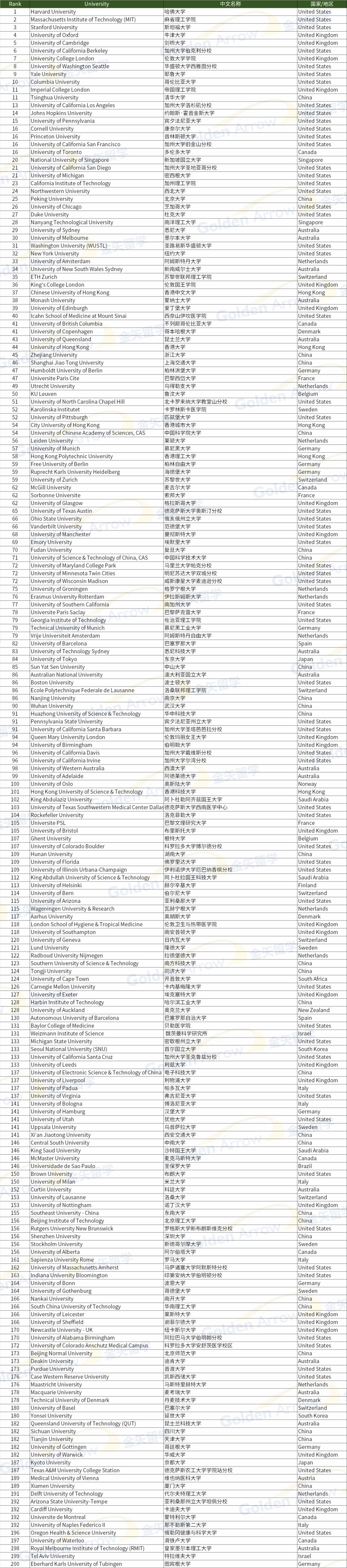 2025-2026 U.S. News全球最佳院校Top200