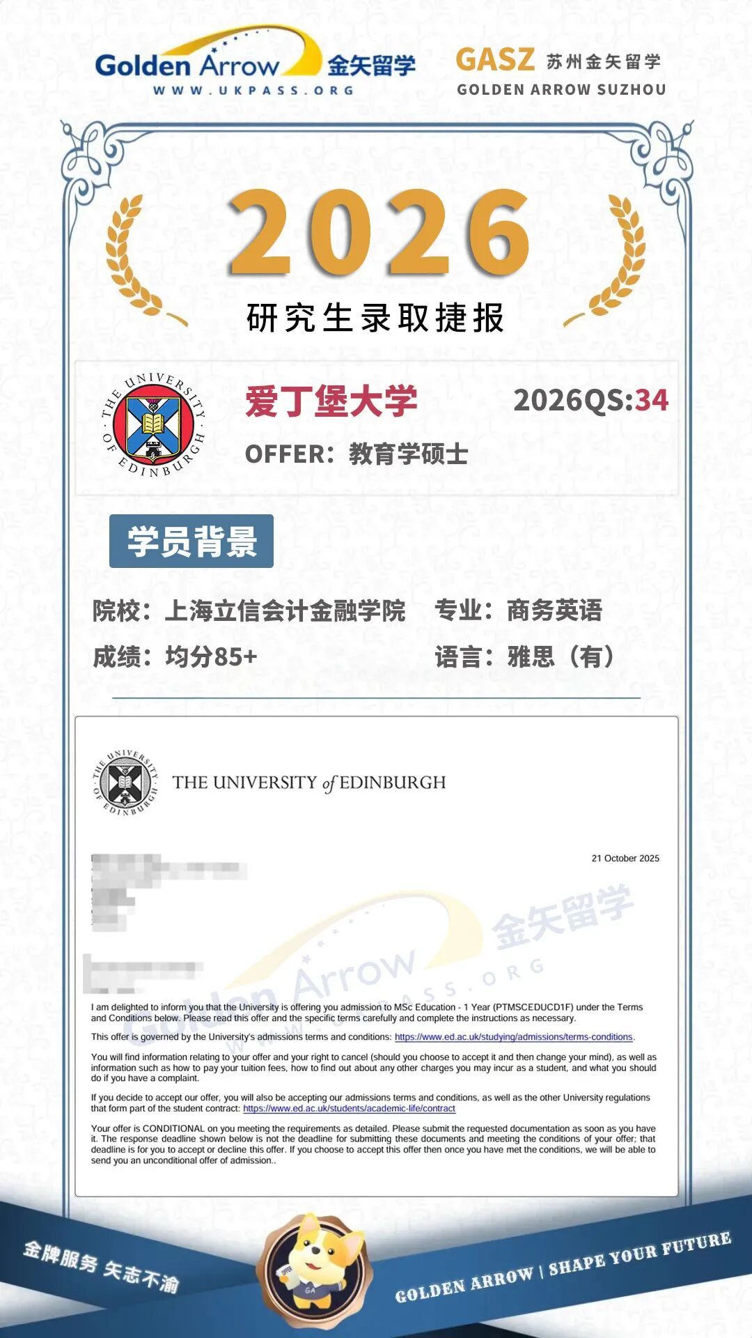 2026爱丁堡大学教育学硕士录取offer