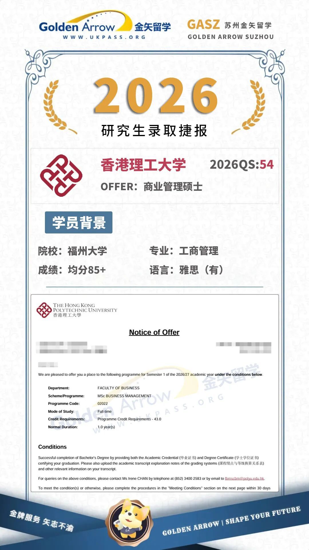 香港大学申请案例:福州大学工商管理专业的学生,以均分85+有雅思的背景,在金矢留学的指导下成功获得了2026QS世界大学排名中排行第54名的香港理工大学商业管理硕士的录取,下面一起来看下该专业及录取offer!
